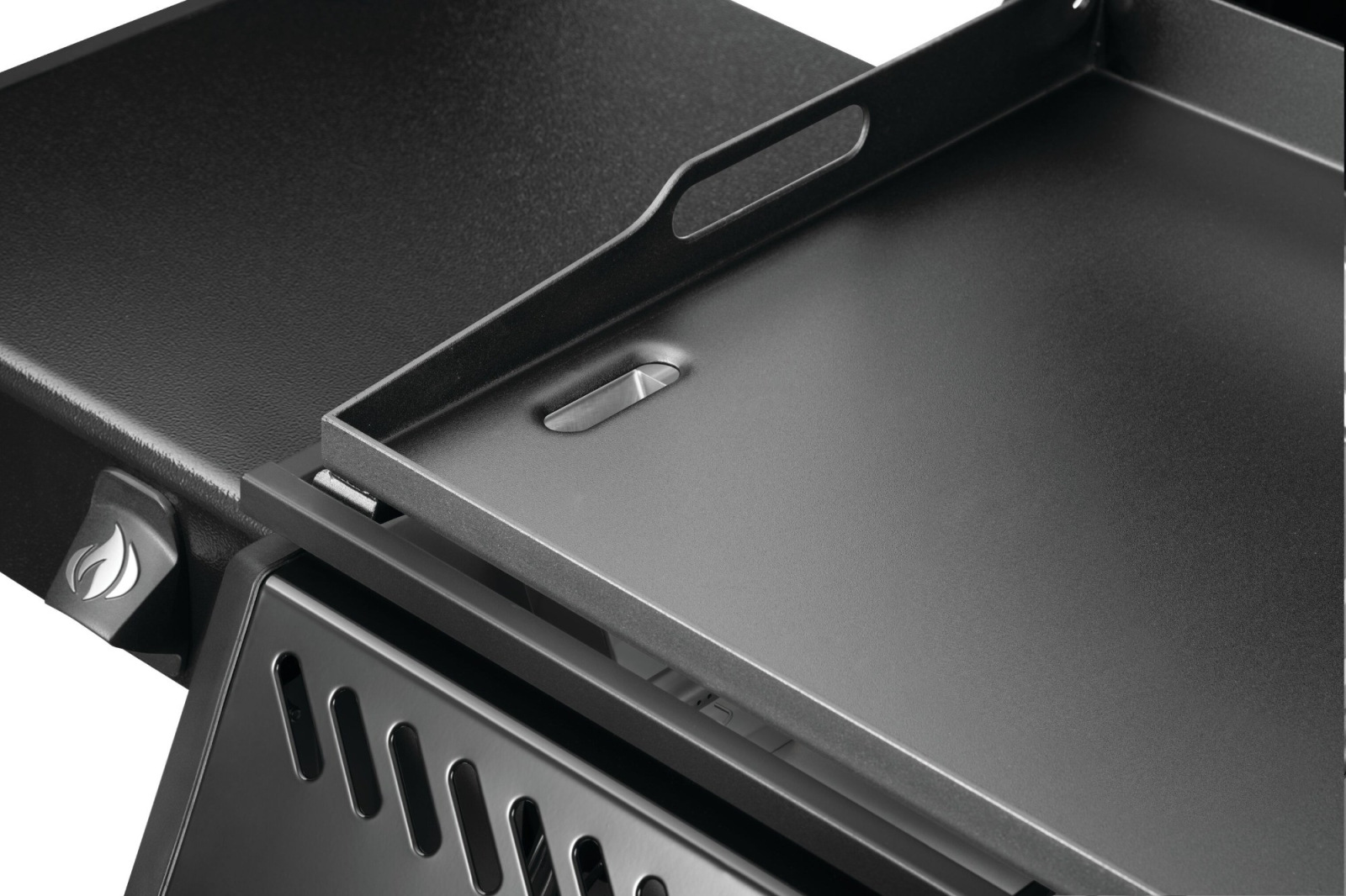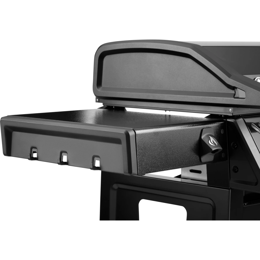 - Sklopné bočné police s háčikmi na náradie poskytujú praktický úložný priestor, keď práve negrilujete.