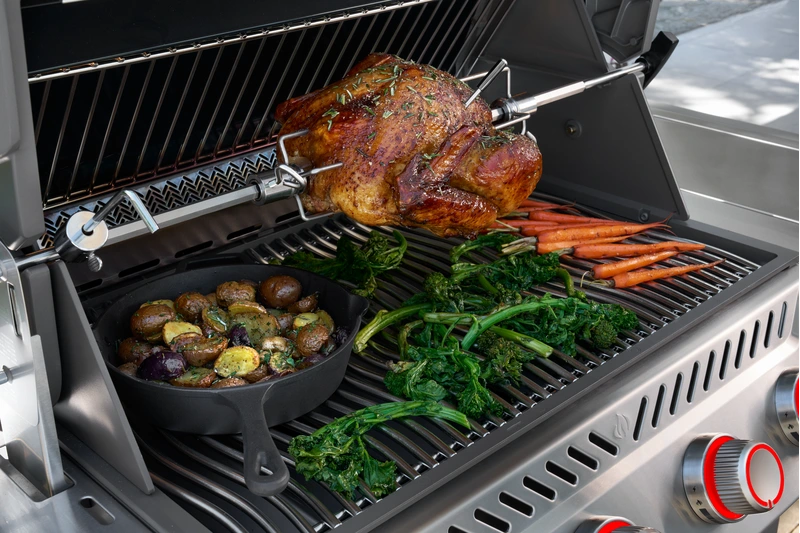 Samostatný SmokerBox sa dá jednoducho pripevniť priamo ku grilu. Umožní vám údiť horúcim aj studeným dymom, pričom teplotu pohodlne nastavíte priamo na grile. - Všetky grilovacie rošty sú vyrobené z masívnej nehrdzavejúcej ocele s ikonickým WAVE™ dizajnom, ktorý zabezpečuje rovnomerné prepečenie a typický grilovací vzor. Rovnaká kvalita pokračuje aj pod vekom – nerezová grilovacia komora, trubicové horáky a dvojúrovňové tepelné clony zaručujú perfektnú distribúciu tepla a minimalizujú vzplanutie tuku.